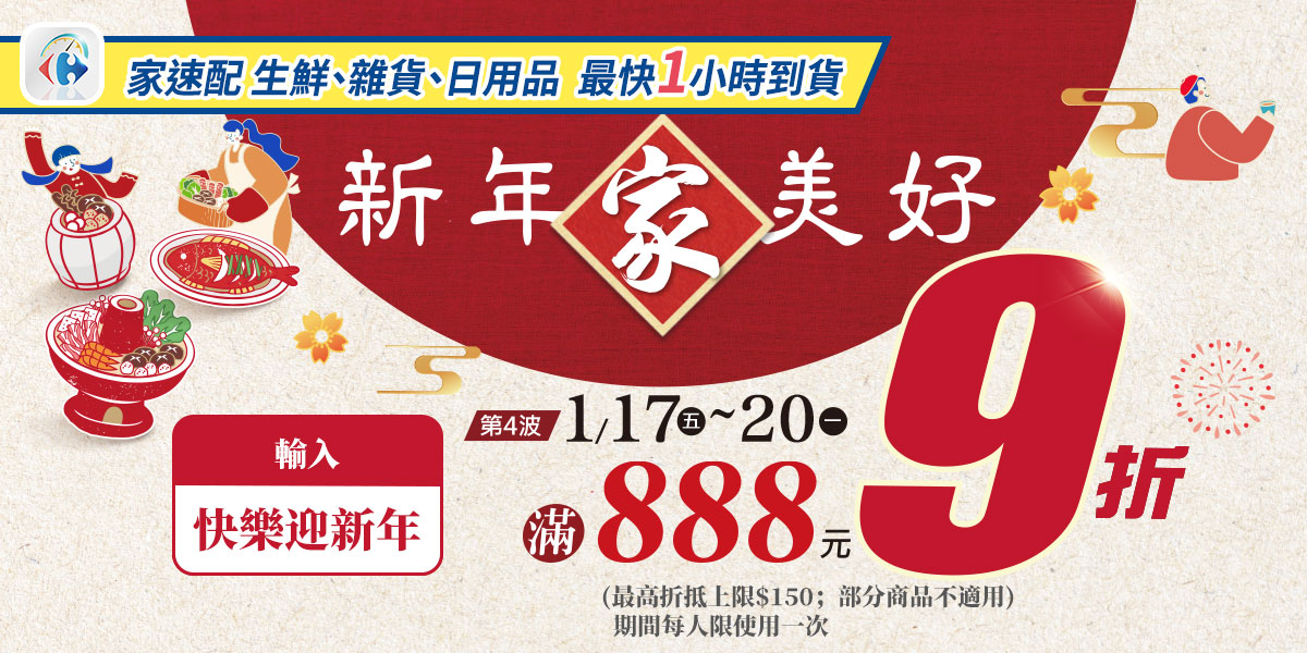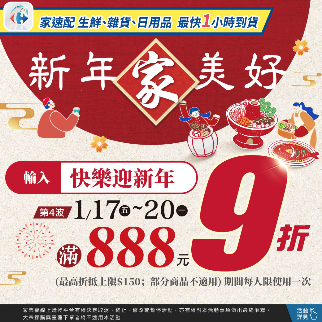 - 結帳輸入折扣碼「快樂迎新年」,單筆消費折扣後滿$888享9折,最高折抵金額$150。部分商品不適用折扣碼。