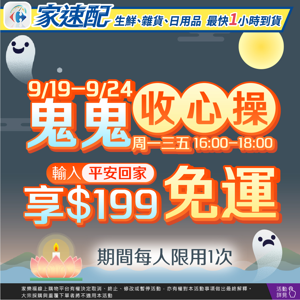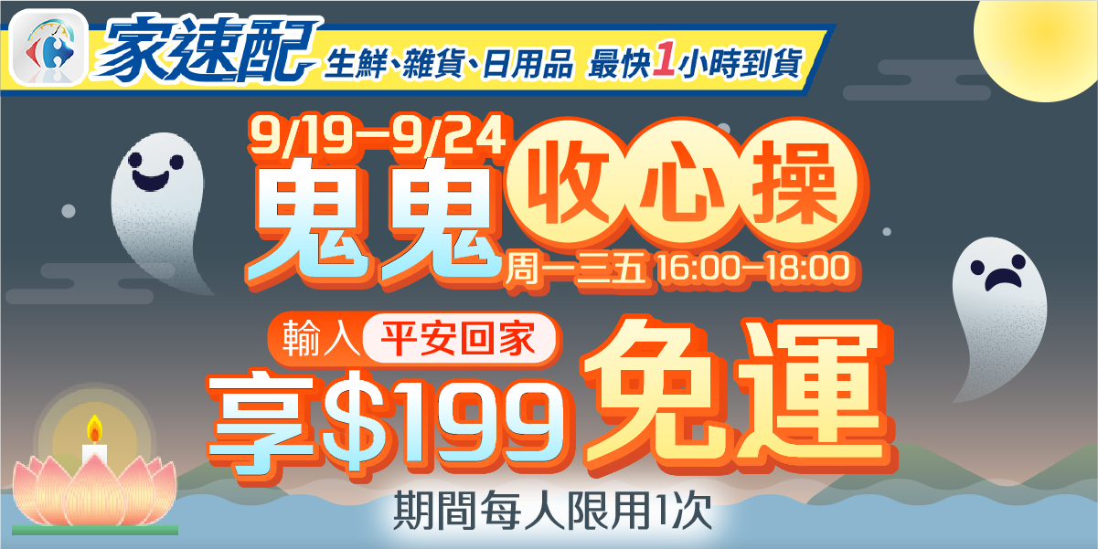 - 期間週一、三、五⏰時段16:00-18:00,結帳輸入折扣碼「平安回家」,單筆折扣後滿$199享免運費。