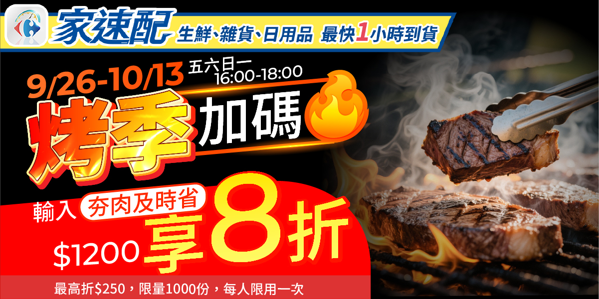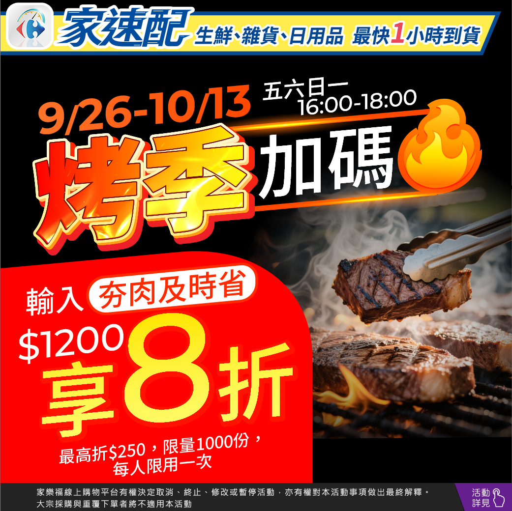 - 結帳輸入折扣碼「夯肉及時省」單筆消費折扣後滿$1200享8折(最高折$250,部分商品不適用)