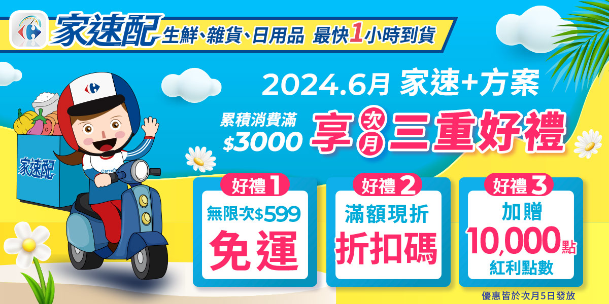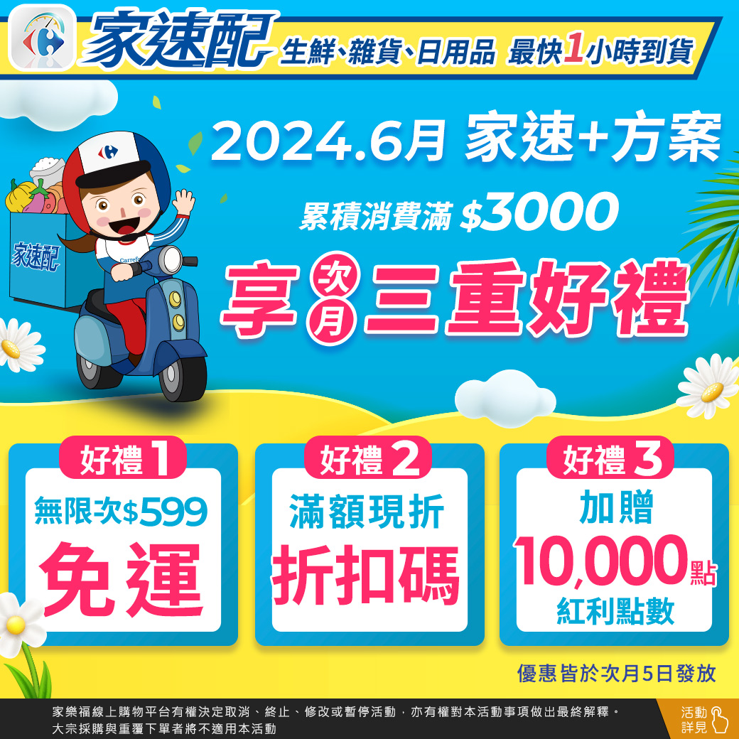 - 2024/06/01-06/25於家樂福《家速配APP》累積消費滿$3,000,享三重好禮。