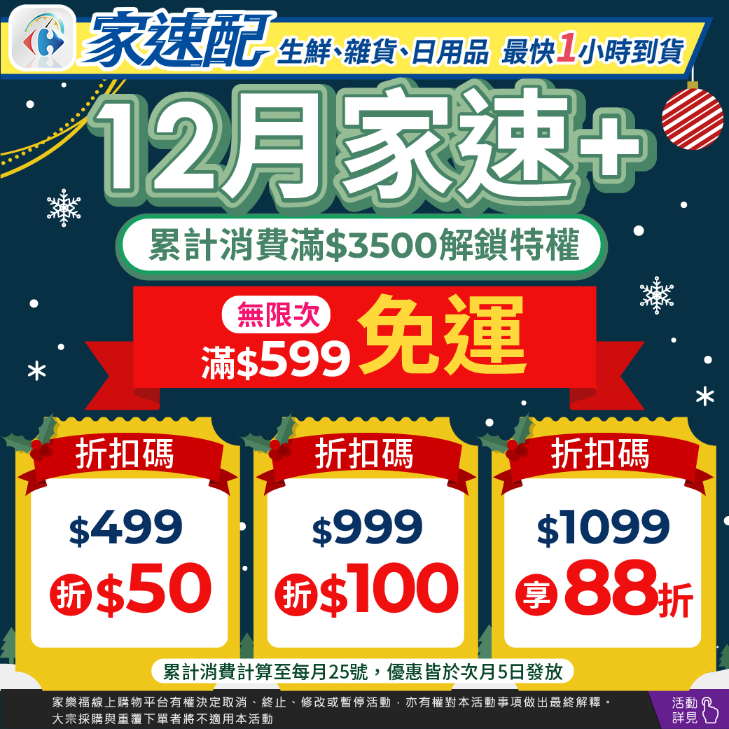 - 期間於家樂福《家速配APP》累積消費滿$3,500,享多項好禮。