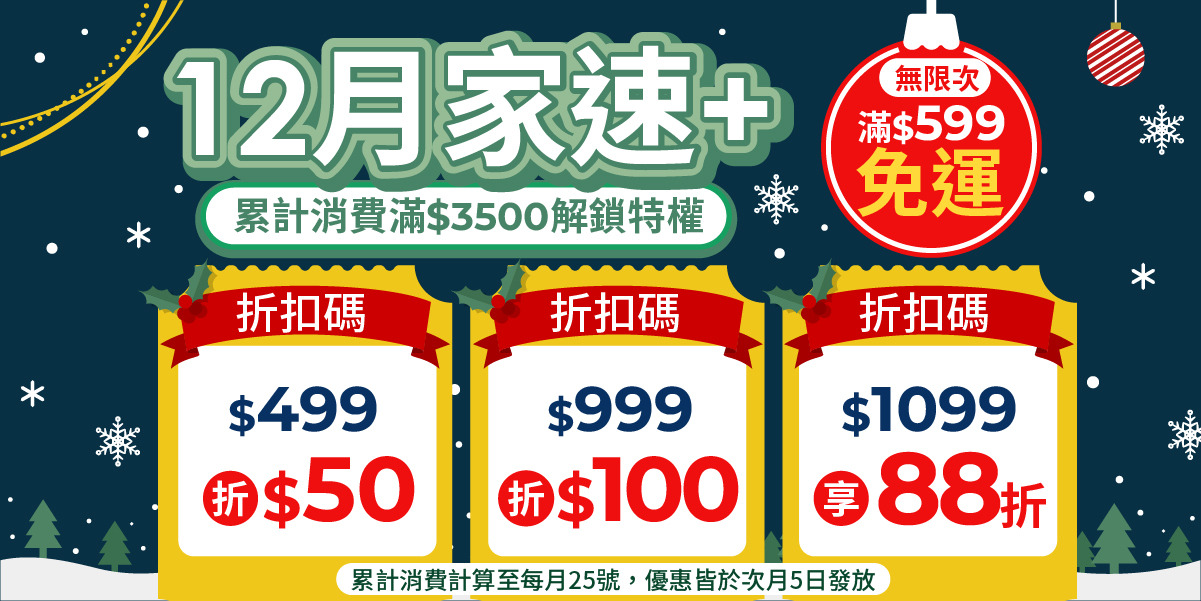 - 使用方式:消費單筆折扣後金額滿599元即享免運優惠,不限當月使用次數。