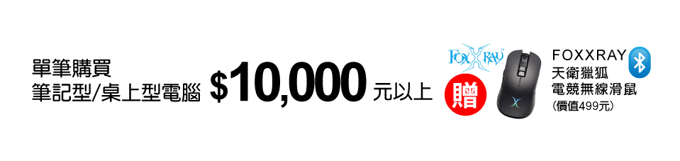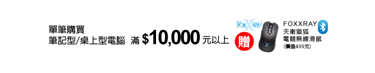 活動期間,單品購買筆記型/桌上型電腦滿$10,000元以上即贈FOXXRAY天衛獵狐電競無線滑鼠(價值499元),單筆不累贈送完為止(如購物車未出現贈品)即代表出貨店贈品已贈完)。