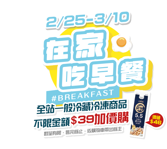 - 活動期間,全站一般訂單冷凍冷藏商品,不限金額可以39元加價購大醇豆無加糖5.5濃豆漿936毫升一瓶,每品單筆最多加購一件;若購物車未出現加價購品項,即代表該出貨店商品已售完。