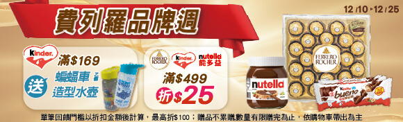 - 活動期間內,單筆購買指定金莎/臻品/健達/能多益商品折扣後滿$499現折$25(最高折$100)