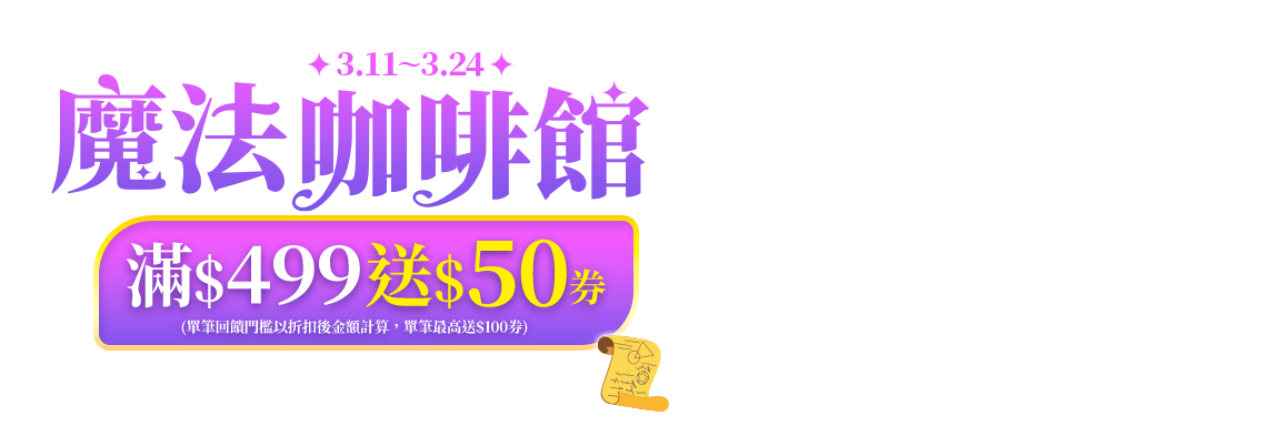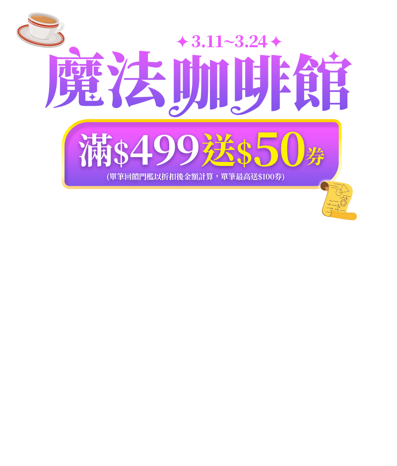 活動期間,購買指定沖調飲品折扣後滿499元,即贈50元線上折價券(單筆最高贈100元券)。