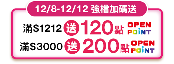 活動二:雙12加碼活動-滿1212送120點OPENPOINT、滿3000送200點OPENPOINT