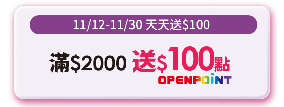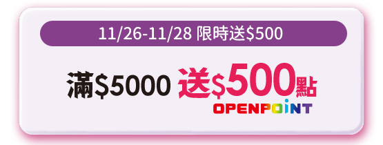 活動辦法: 本活動期間2025/11/26-2025/11/28,於 『家樂福線上商城』 消費單筆折扣後滿$5000,且訂單未取消或退貨,則可獲得500點OPENPOINT點數(以下簡稱【OP點數】); 本訂單所獲得之【OP點數】,將於訂單送達後 約3 天內入點,點數發送後將不另行通知,請直接利用